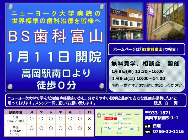 S歯科富山インプラントオフィスでは、来る2016年1月8、9日の2日間、新規開院に伴い、無料見学、相談会を実施します。
