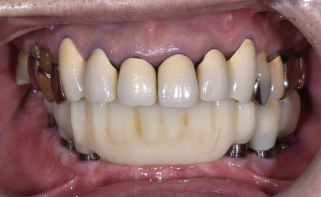 治療終了時:セット後3ヶ月の口腔内写真。噛み合わせ、審美性、発音いずれも問題なく経過しています。